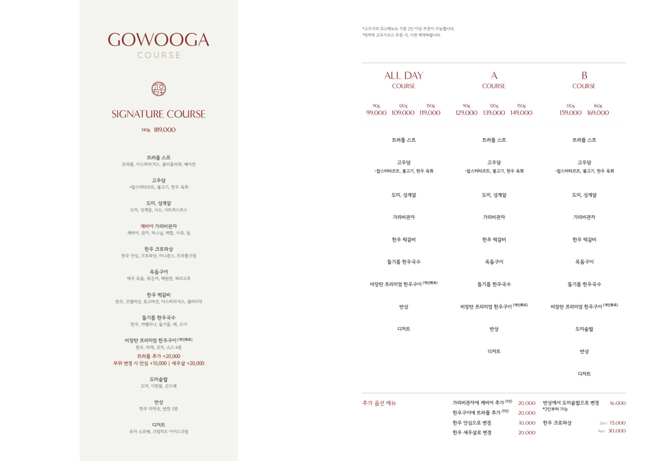 고우가 여의도점에는 다양한 코스가 있었지만 제가 먹은 코스는 ALL DAY A course의 120g + 도미 솥밥으로 변경해서 먹었습니다.